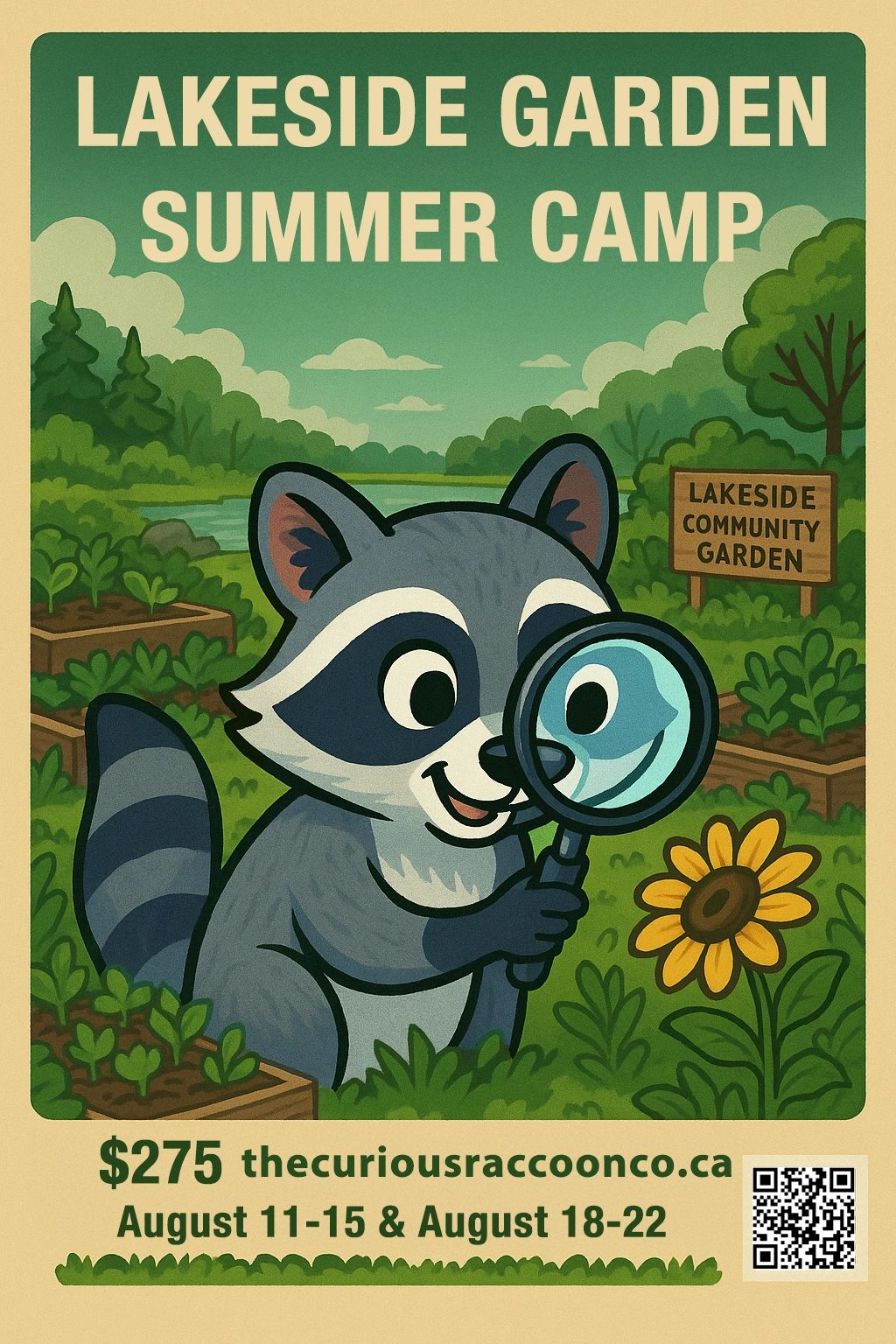 We are thrilled to partner with the Lakeside Community Garden to host a fantastic summer camp! Campers can expect to be outside all day, rain or shine. Throughout the week we will be gardening, doing cool science experiments, creating art, creating bird houses, and learning important outdoor skills like map and compass reading. The camp will run from 9 am to 4 pm, Monday to Friday the weeks of August 11-15 and 18-22, 2025. Registration is $275/week/camper. For more information, email us at info@thecuriousraccoonco.ca.